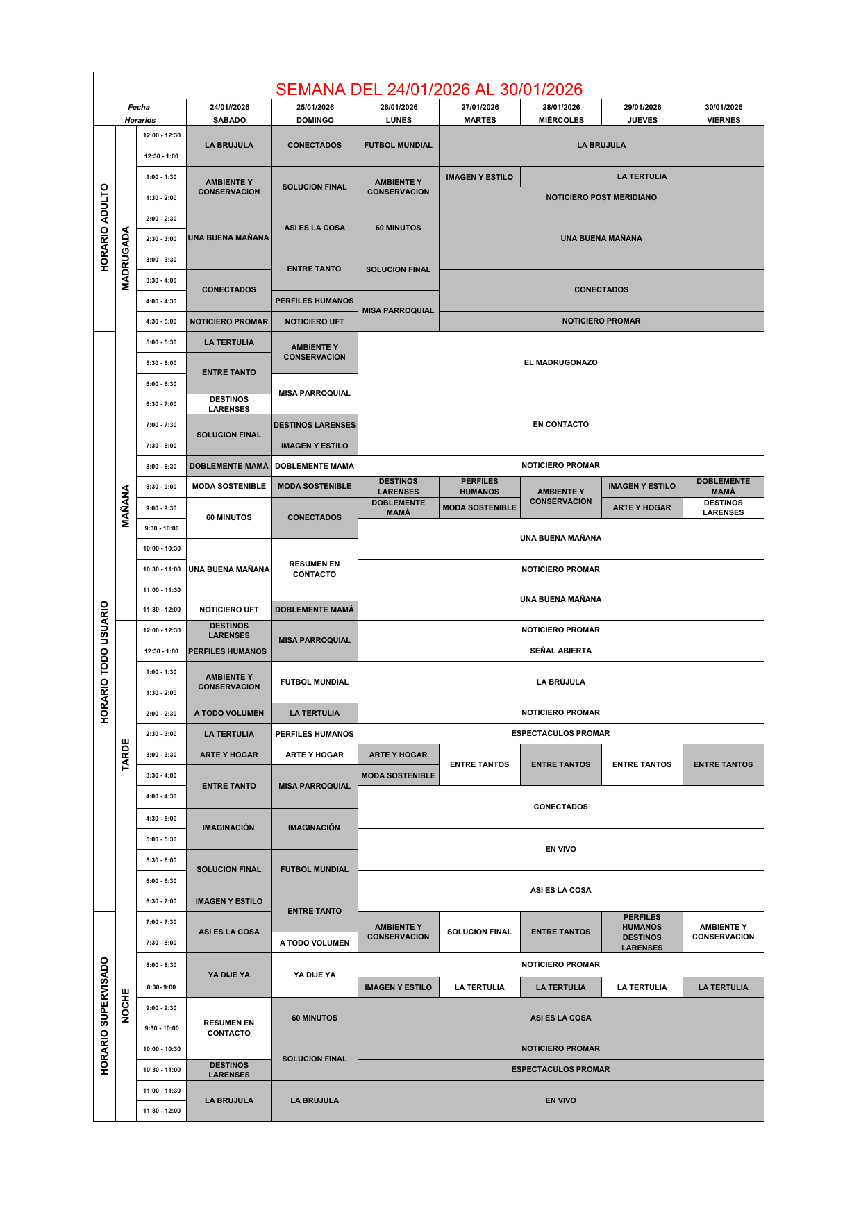 Programación entre el día sábado 24 al viernes 30 de enero de 2026 23 de enero de 2026 - 11:25 pm Programación 7,134 Vistas 2026-01-23 Javier Caceres Compartir Facebook Twitter LinkedIn Pinterest