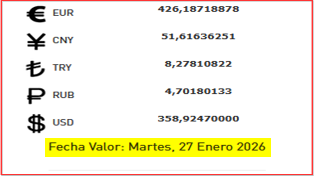 BCV. Tipo de cambio oficial para transacciones del martes 27 de octubre de 2026 26 de enero de 2026 - 6:07 pm Economia, Noticias 59 Vistas BCV tipo de cambio bs / $ 2026-01-26 Javier Caceres Compartir Facebook Twitter LinkedIn Pinterest