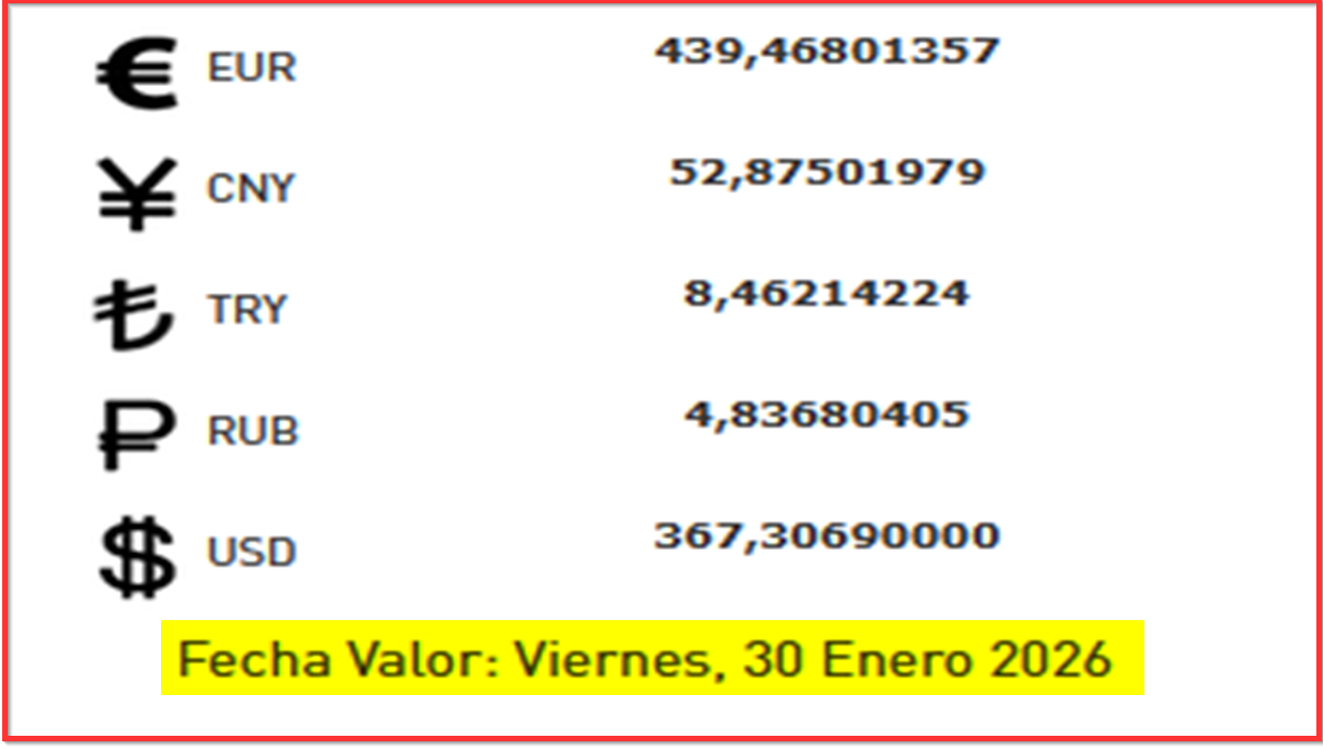 BCV . Cambio oficial para las transacciones del viernes 30 de enero de 2026 29 de enero de 2026 - 5:58 pm Noticias 48 Vistas 2026-01-29 Javier Caceres Compartir Facebook Twitter LinkedIn Pinterest
