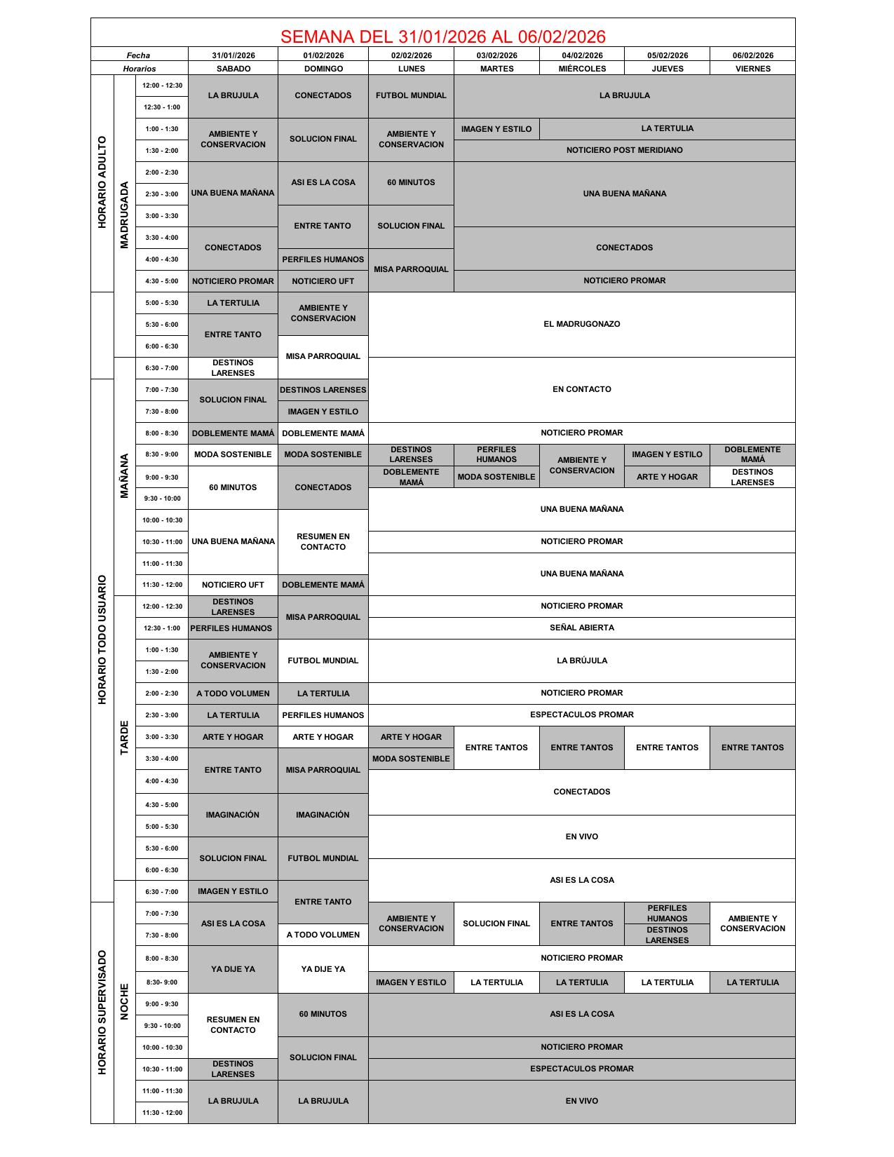 Programación desde el día sábado 31 de enero hasta el viernes 6 de febrero de 2026 30 de enero de 2026 - 11:23 pm Programación 64 Vistas 2026-01-30 Javier Caceres Compartir Facebook Twitter LinkedIn Pinterest