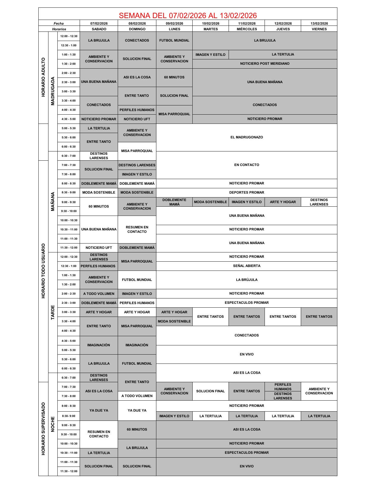 Programación desde el día sábado 7 de febrero hasta el viernes 13 de febrero de 2026 06 de febrero de 2026 - 10:53 pm Programación 250 Vistas 2026-02-06 Javier Caceres Compartir Facebook Twitter LinkedIn Pinterest