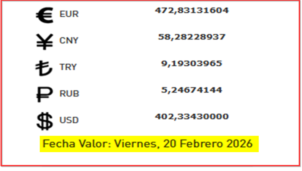 BCV. Tipo de cambio oficial para transacciones del viernes 20 de febrero 2026 19 de febrero de 2026 - 5:25 pm Economia, Noticias 59 Vistas 2026-02-19 Javier Caceres Compartir Facebook Twitter LinkedIn Pinterest