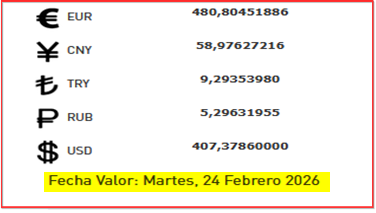 BCV. Tipo de cambio oficial para transacciones del martes 24 de febrero de 2026 23 de febrero de 2026 - 6:07 pm Economia, Noticias 59 Vistas 2026-02-23 Javier Caceres Compartir Facebook Twitter LinkedIn Pinterest