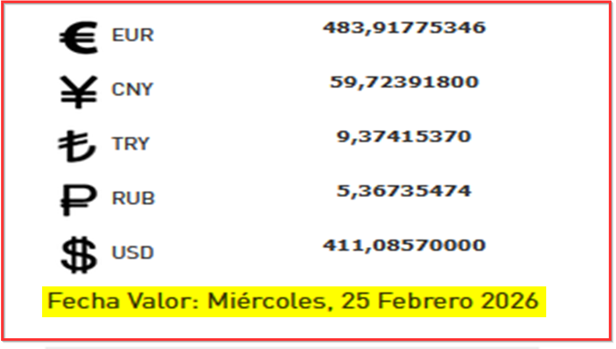 BCV. Tipo de cambio oficial para transacciones del miércoles 25 de febrero de 2026 24 de febrero de 2026 - 6:29 pm Economia, Noticias 53 Vistas 2026-02-24 Javier Caceres Compartir Facebook Twitter LinkedIn Pinterest