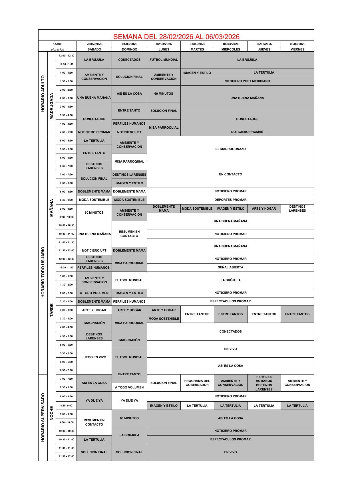 Programación desde el día sábado 28 de febrero hasta el viernes 6 de marzo de 2026 27 de febrero de 2026 - 6:57 pm Programación 48 Vistas 2026-02-27 Javier Caceres Compartir Facebook Twitter LinkedIn Pinterest