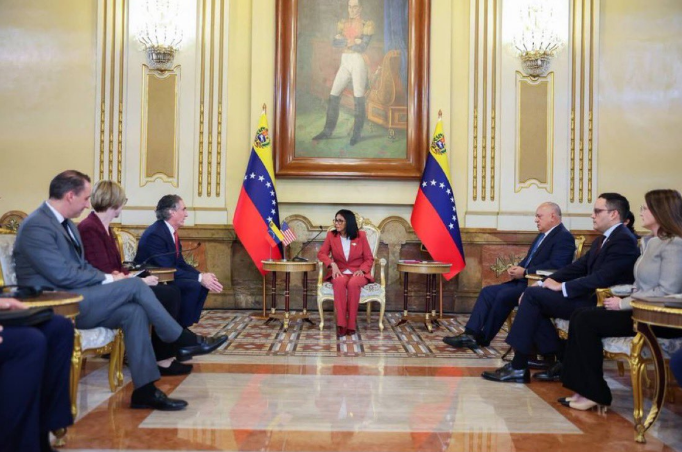 La presidenta encargada de Venezuela, Delcy Rodríguez, recibió este miércoles en el Palacio de Miraflores, Caracas, al secretario de Interior de Estados Unidos, Doug Burgum, para abordar temas de interés en la cooperación energética y fortalecer el sector minero.