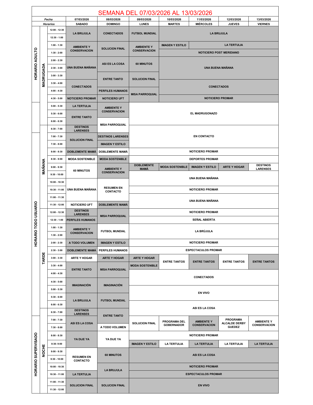 Programación desde el día sábado 7 de hasta el viernes 13 de marzo de 2026 06 de marzo de 2026 - 11:14 pm Programación 56 Vistas 2026-03-06 Javier Caceres Compartir Facebook Twitter LinkedIn Pinterest