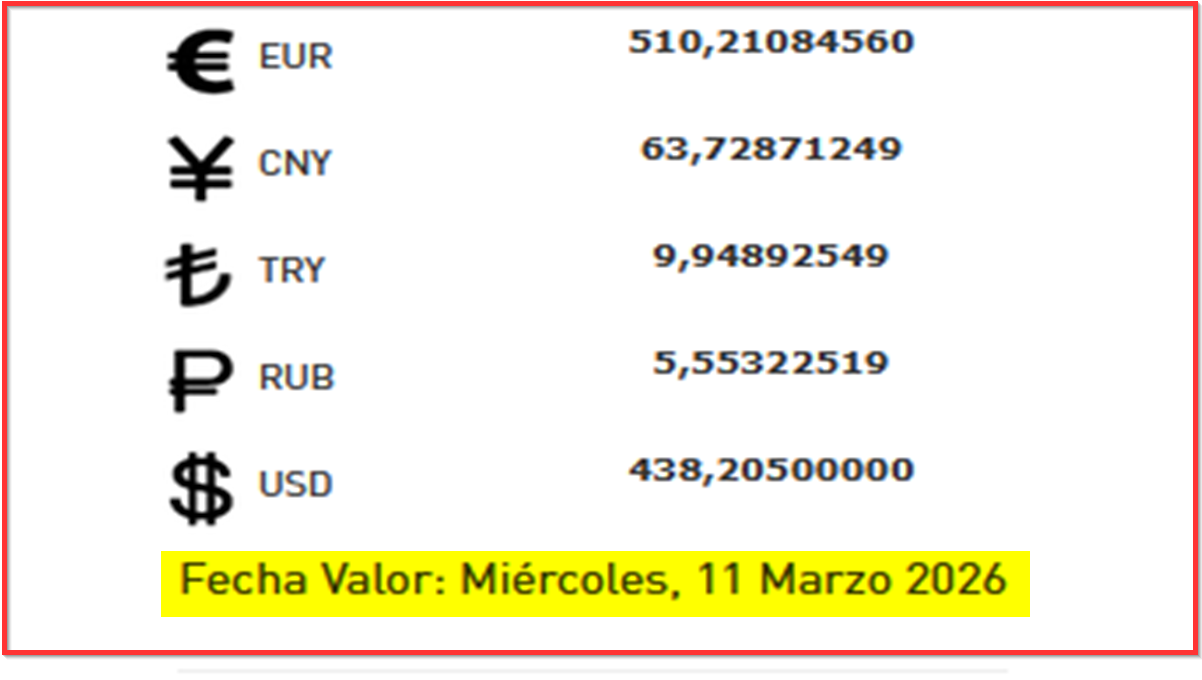 BCV. Tipo de cambio oficial para transacciones del miércoles 11 de marzo de 2026 10 de marzo de 2026 - 6:29 pm Economia, Noticias 57 Vistas 2026-03-10 Javier Caceres Compartir Facebook Twitter LinkedIn Pinterest