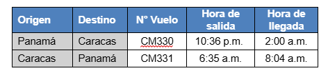 Esta frecuencia operará los lunes, martes, miércoles, jueves y sábado, y se prevé que alcance operación diaria a partir del 1 de junio de 2026. Las frecuencias diurnas CM223 y CM224 continuarán operando en sus horarios habituales. Actualmente, la aerolínea mantiene 19 frecuencias semanales entre Caracas y Panamá, además de siete vuelos semanales desde Maracaibo, consolidando así su presencia en el país.