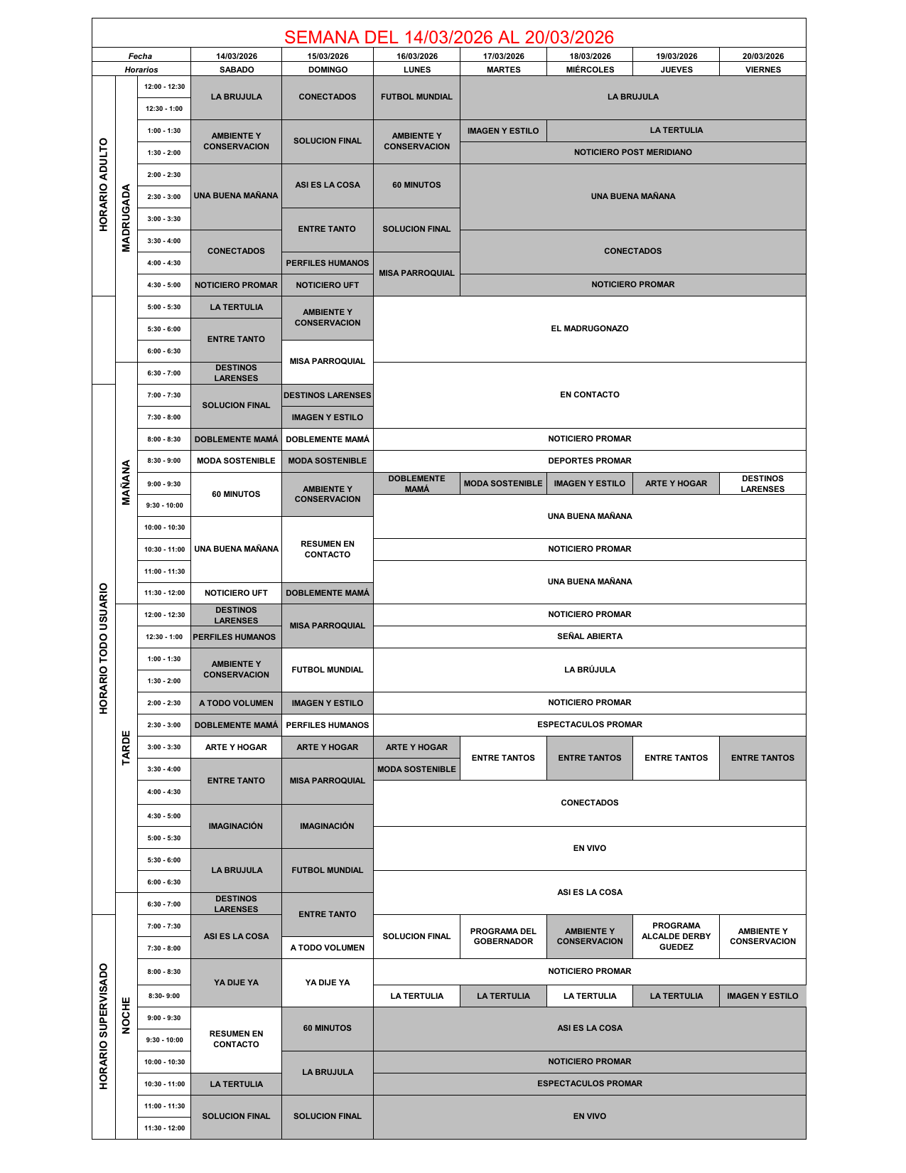 Programación desde el día sábado 14 hasta el viernes 20 de marzo de 2026 13 de marzo de 2026 - 10:53 pm Programación 235 Vistas 2026-03-13 Javier Caceres Compartir Facebook Twitter LinkedIn Pinterest