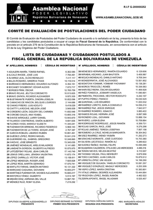 Inicio / Noticias / Nacionales / Presentaron lista de postulados para los cargos de Fiscal General de la República y Defensor del Pueblo