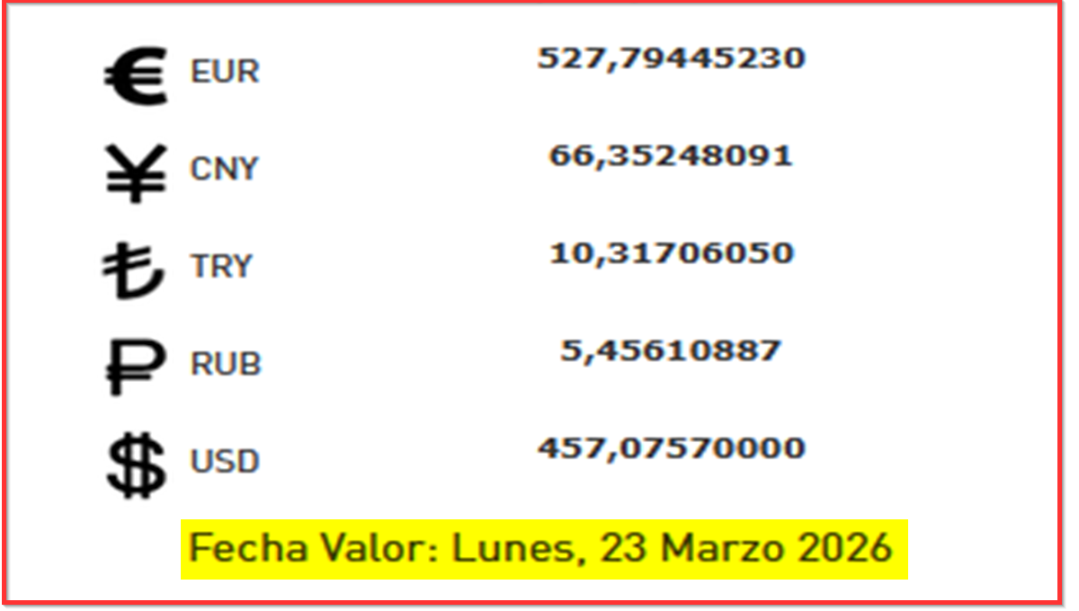 BCV. Tipo de cambio de referencia para transacciones desde el sábado 21 al lunes 23 de marzo de 2026 20 de marzo de 2026 - 9:20 pm Economia, Noticias 58 Vistas 2026-03-20 Javier Caceres Compartir Facebook Twitter LinkedIn Pinterest