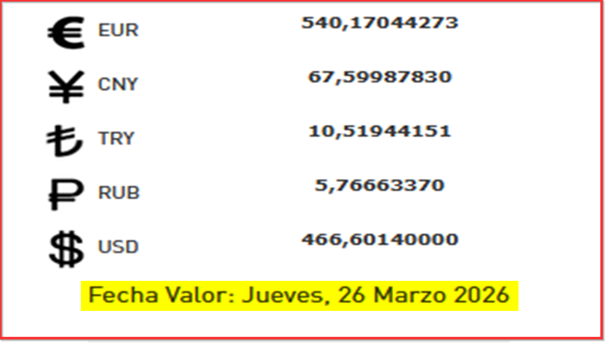 BCV. Tipo de cambio de referencia para transacciones del jueves 26 de marzo 2026 25 de marzo de 2026 - 6:11 pm Economia, Noticias 41 Vistas 2026-03-25 Javier Caceres Compartir Facebook Twitter LinkedIn Pinterest