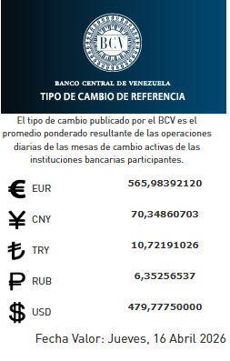 BCV. Tipo de cambio de referencia para transacciones del jueves 16 de abril 2026 16 de abril de 2026 - 7:17 am Internacional 64 Vistas 2026-04-16 Equipo de Prensa Compartir Facebook Twitter LinkedIn Pinterest