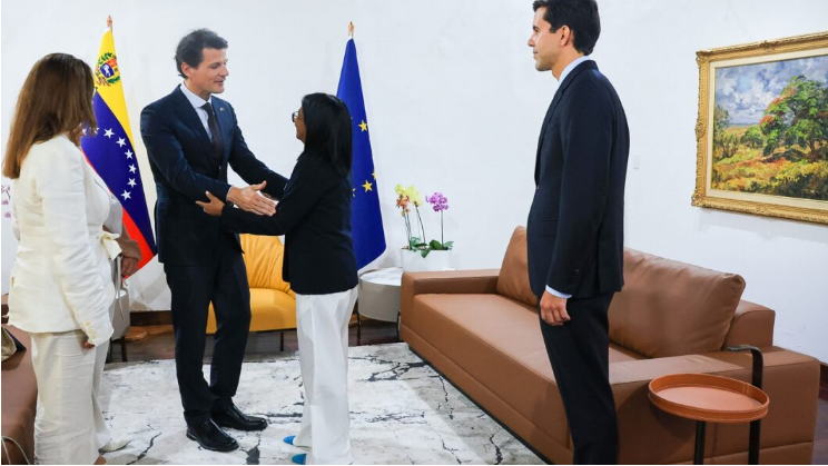La presidenta encargada de la República, Delcy Rodríguez, recibió en el Palacio de Miraflores a una delegación de alto nivel de la Unión Europea (UE) y el Servicio Europeo de Acción Exterior (SEAE). El encuentro, que contó con la participación de Pelayo Castro (SEAE), María Antonia Calvo Puerta (UE) y Adriana Vásquez (América del Sur), tuvo como eje central el diseño de una agenda de trabajo conjunta para potenciar áreas estratégicas y cooperación bilateral. Acompañó la jornada el viceministro para Europa y América del Norte, Oliver Blanco, en una cita que busca cimentar una nueva etapa de relaciones productivas basadas en el respeto mutuo y el diálogo político