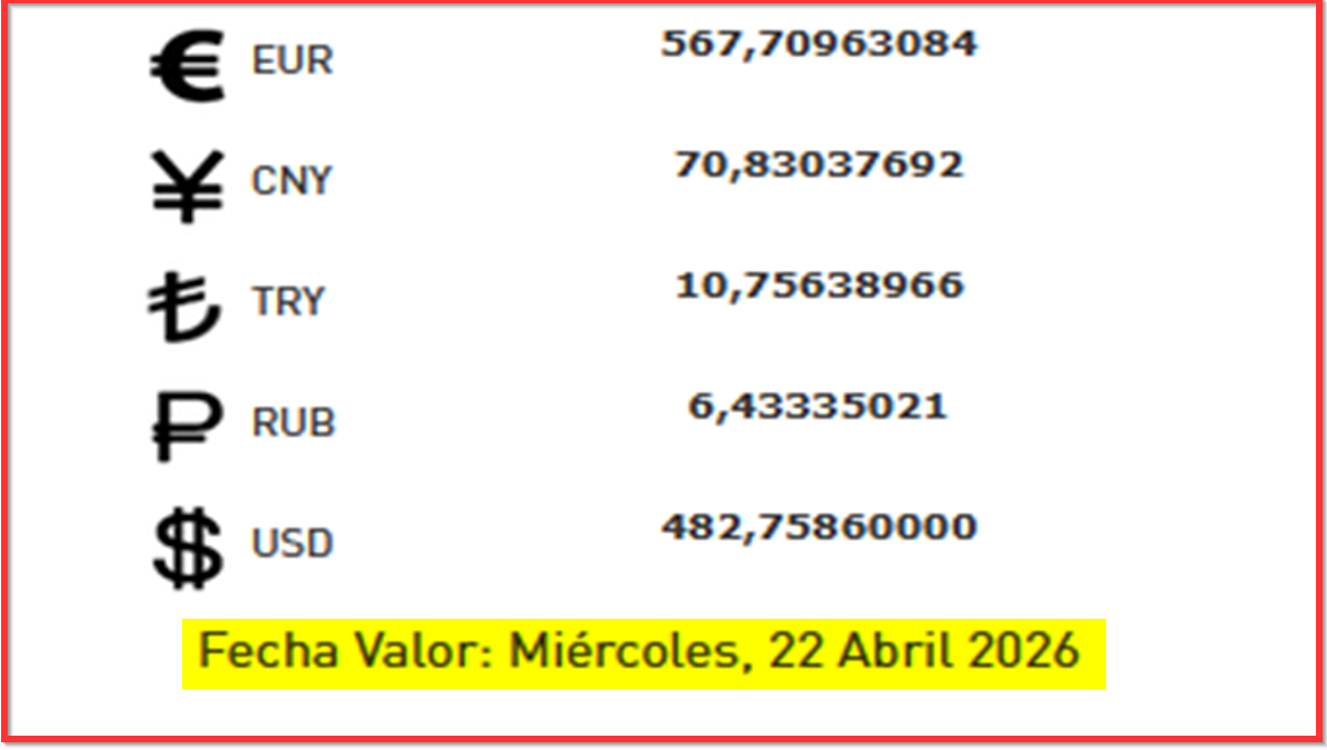 BCV. Tipo de cambio para transacciones del miércoles 22 de abril 2026 21 de abril de 2026 - 5:20 pm Economia, Noticias 57 Vistas 2026-04-21 Javier Caceres Compartir Facebook Twitter LinkedIn Pinterest