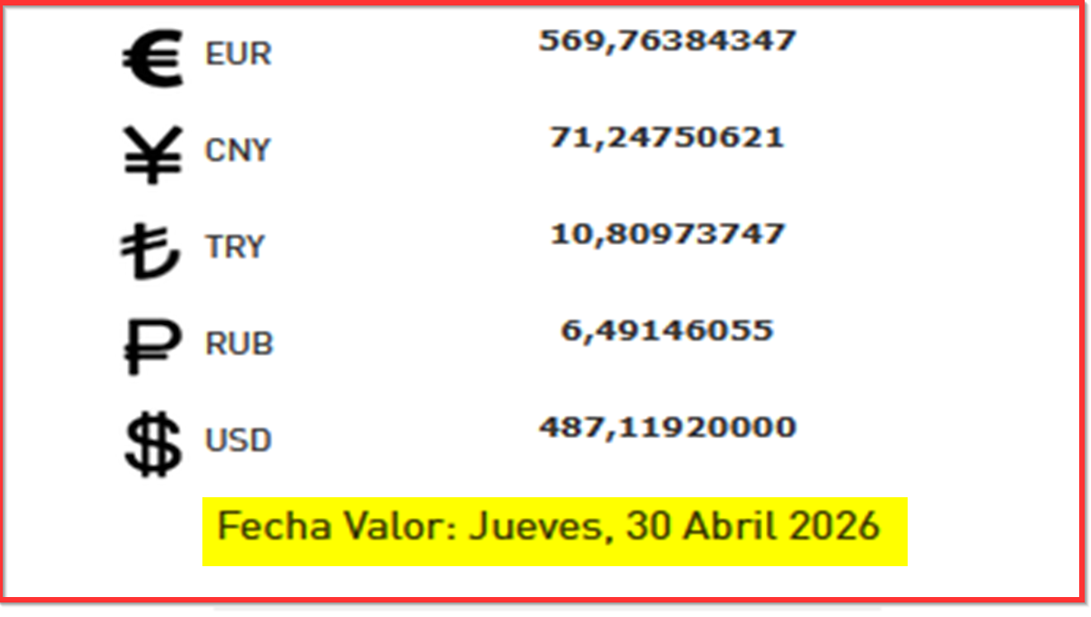 BCV. Tipo de cambio de referencia para transacciones del jueves 30 de abril 2026 29 de abril de 2026 - 6:42 pm Economia, Noticias 54 Vistas 2026-04-29 Javier Caceres Compartir Facebook Twitter LinkedIn Pinterest